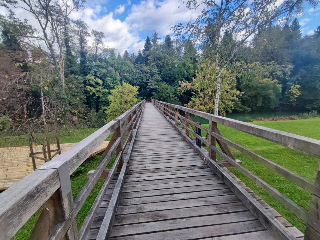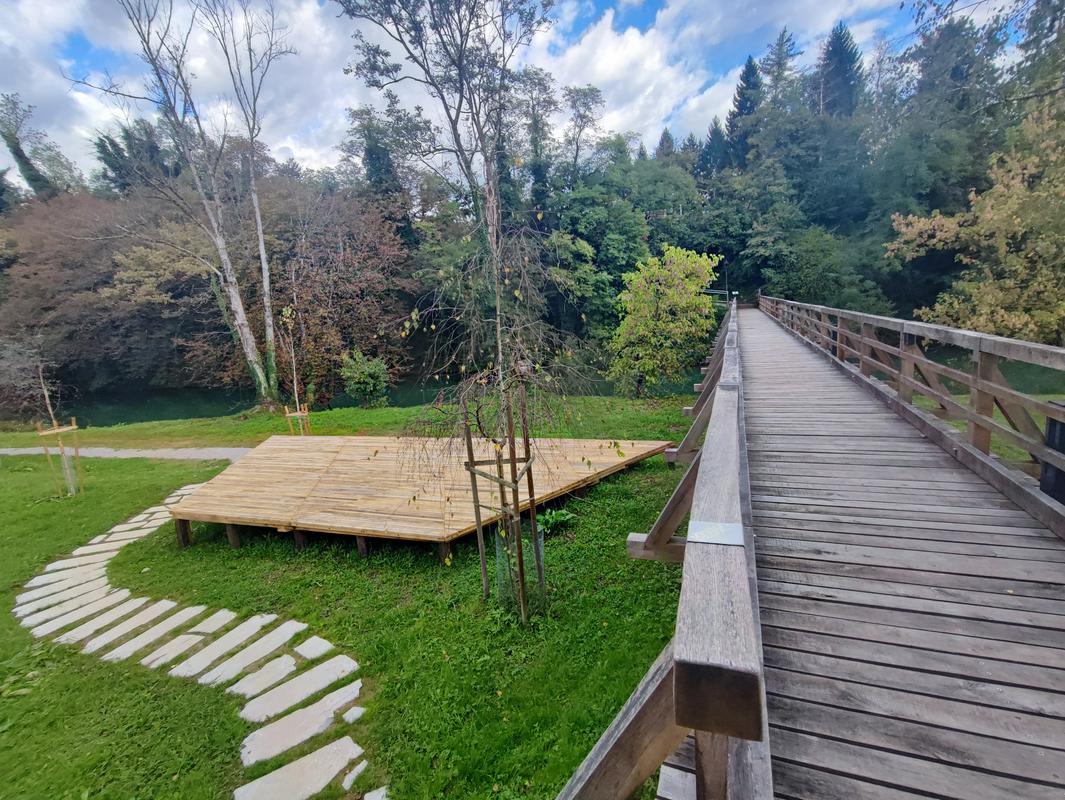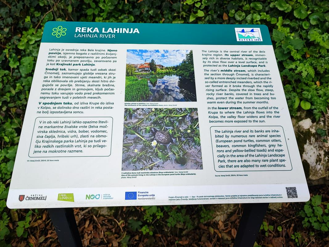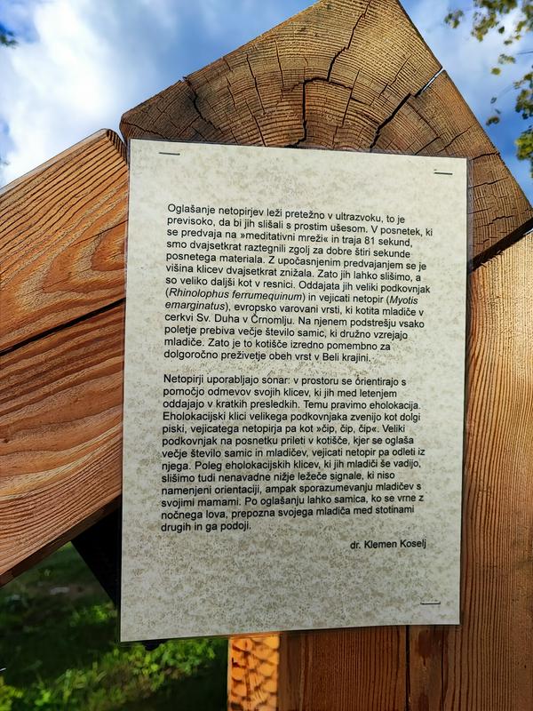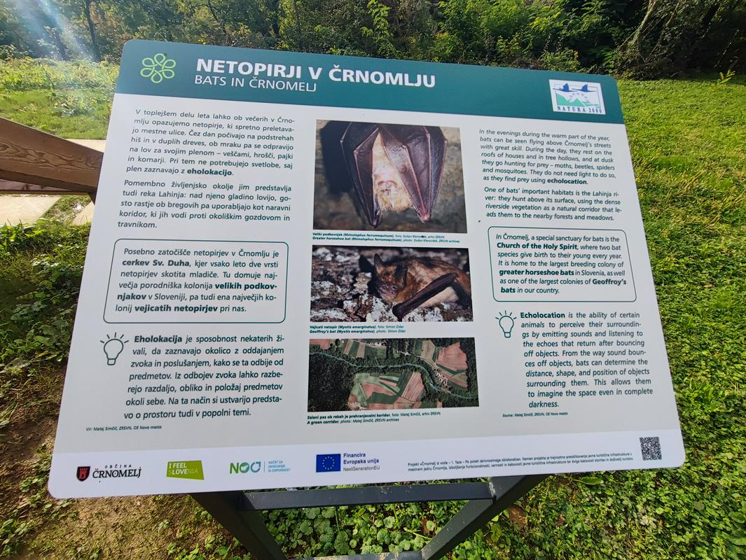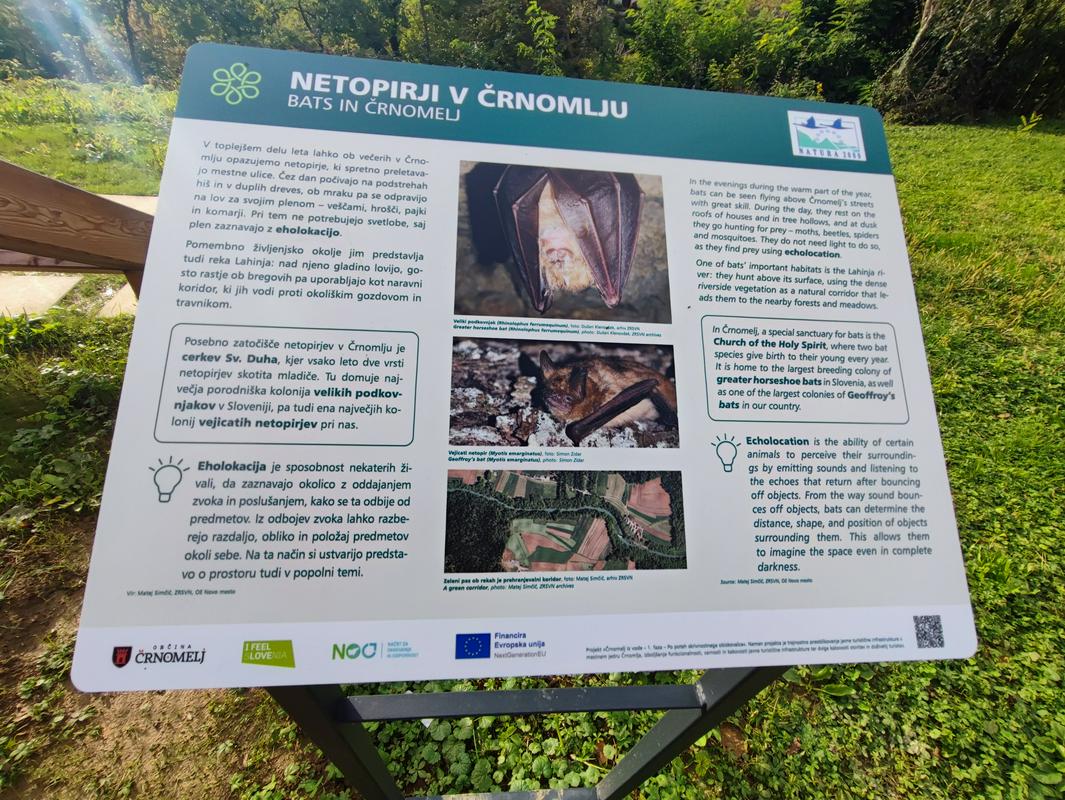 Prenovljen lesen most je zelo fotogeničen, če se sprehodite še malce naprej, pa lahko vidite informacijske table z informacijami o netopirjih. Še malce naprej boste opazili počivališče z mrežo, na katero lahko ležete in prisluhnete zvokom netopirjev. Slišijo se seveda iz zvočnikov, saj človeško uho zvokov na frekvencah, ki jih oddajajo netopirji, ne zazna, so pa s tem zvokom želeli obiskovalce seznaniti, da so v bližini netopirji, na kar so v Črnomlju zelo ponosni, saj gre za žival, ki redko najde svoj prostor med ljudmi, sploh v takšnem številu kot je to v črnomeljski cerkvi. Po navadi namreč netopirje najdemo v jamah, zapuščenih stavbah, kleteh, skrivnih kotičkih v tunelih; skratka tam, kjer "imajo mir" pred zunanjim svetom, kamor se odpravijo skoraj izključno v nočnem času. Podnevi jih redko opazimo, sploh pa ne pozno jeseni in pozimi, ko imajo intenzivno "nočno spanje".