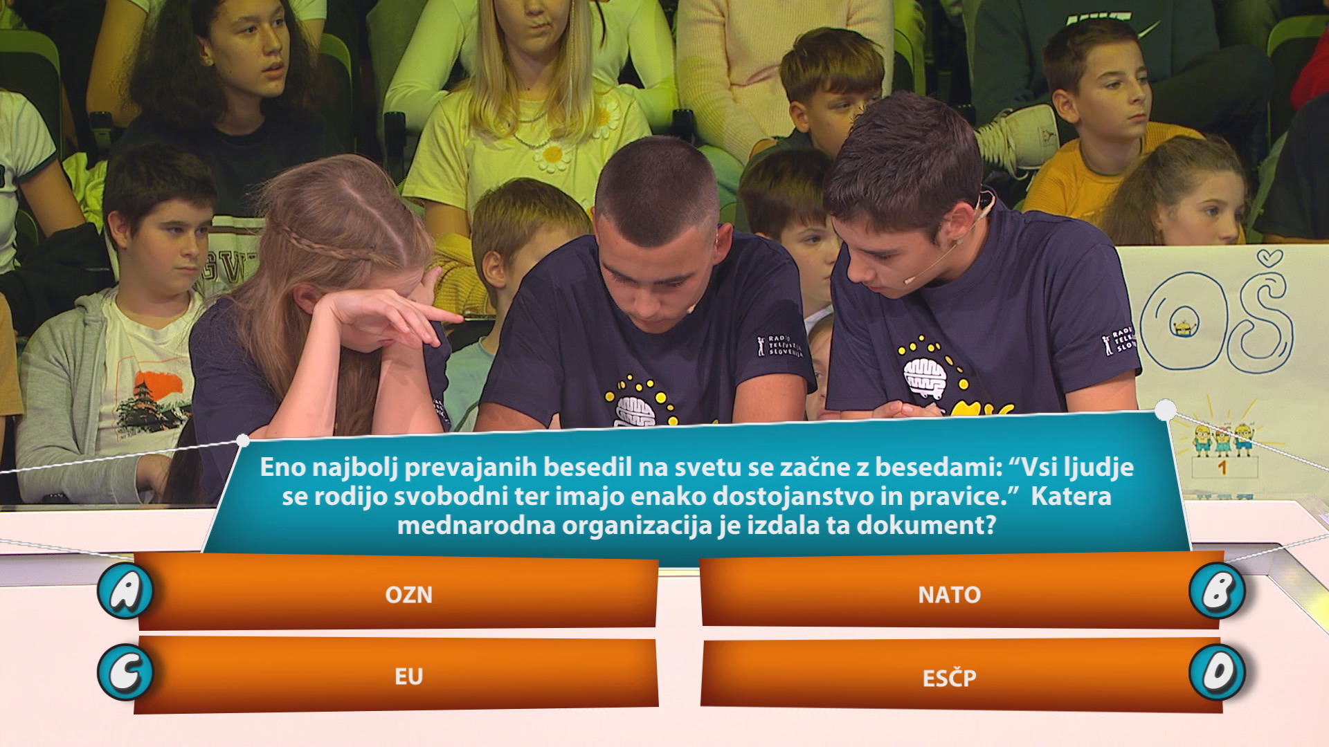 Eno najbolj prevajanih besedil na svetu se začne z besedami “Vsi ljudje se rodijo svobodni ter imajo enako dostojanstvo in pravice.” Katera mednarodna organizacija je izdala ta dokument? a. OZN b. NATO c. EU d. ESČP