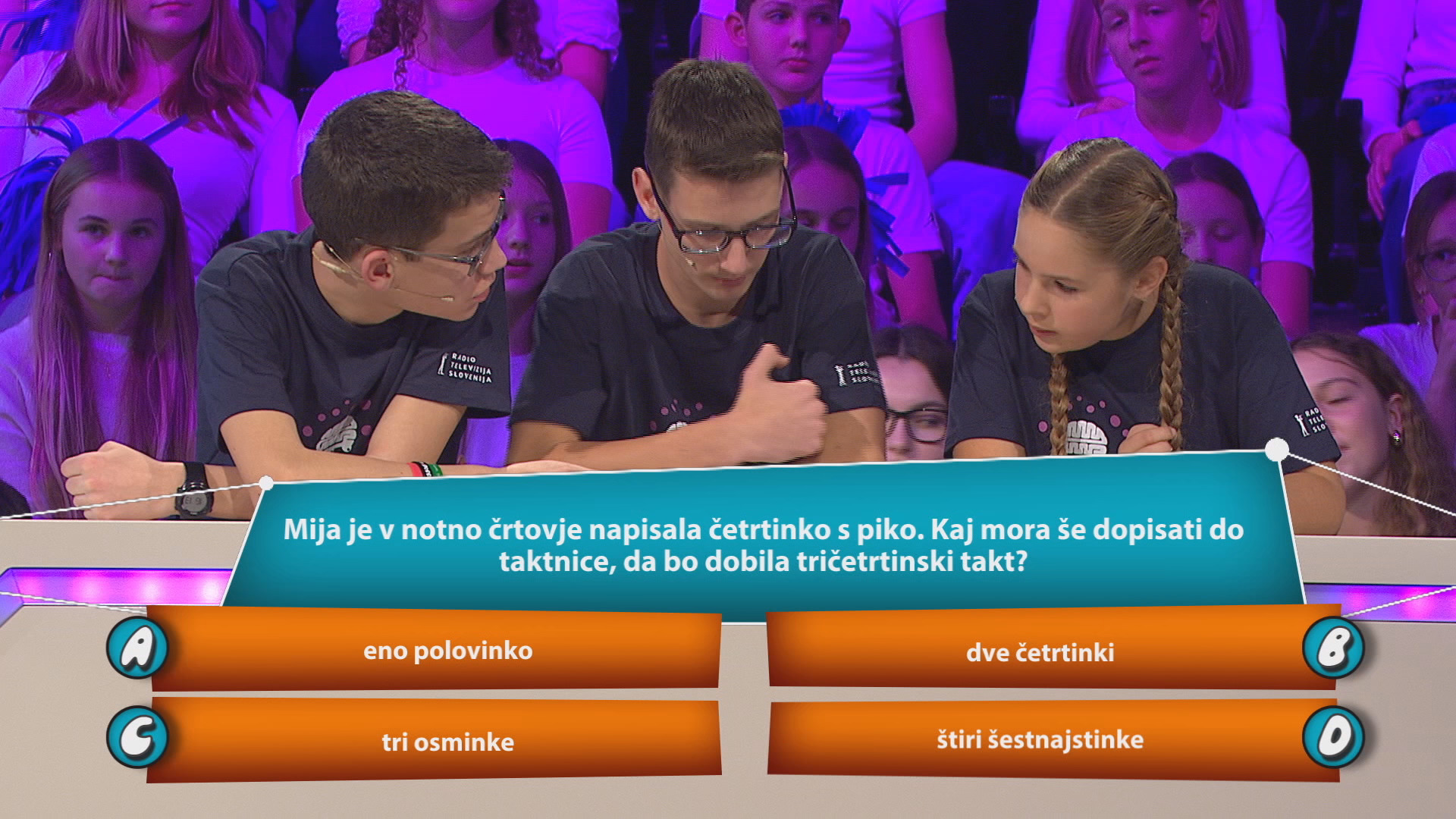 Mija je v notno črtovje napisala četrtinko s piko. Kaj mora še dopisati do taktnice, da bo dobila tričetrtinski takt? a) eno polovinko b) dve četrtinki c) tri osminke d) štiri šestnajstinke
