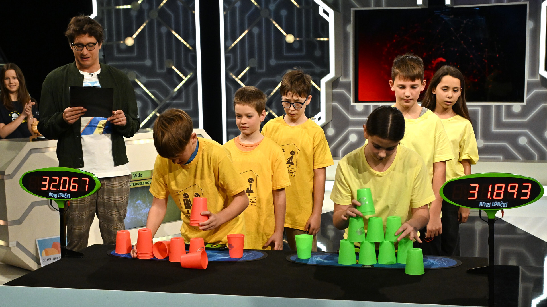 V vedno napetem tekmovanju se bodo pomerili tekmovalci iz OŠ Lucija (Ema, Nika, Luka) in OŠ Franceta Bevka (Erik, Erik, Kristian).
