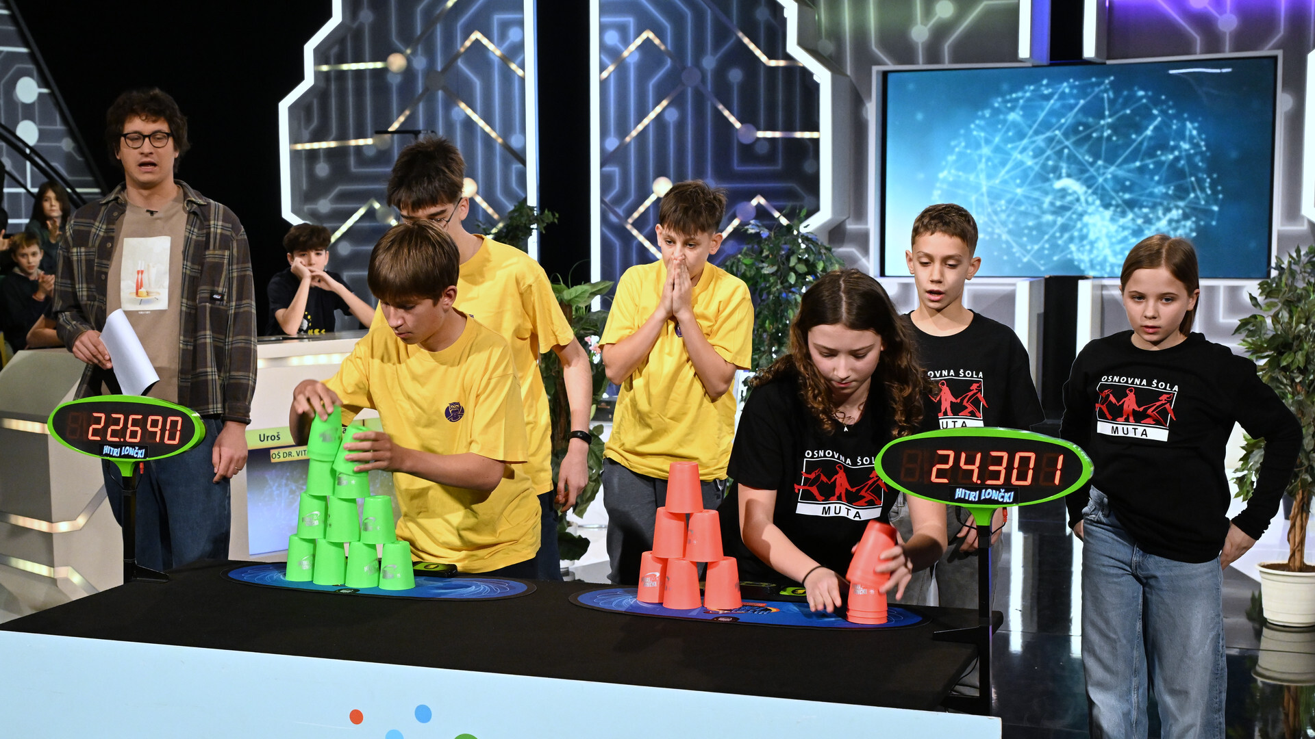 Trenutek resnice za hitrostne sestavljavce lončkov. V vedno napetem tekmovanju se bodo pomerili tekmovalci iz OŠ Brezovica pri Ljubljani (Jaš, Vid, Jurij) in OŠ Muta (Ana, Filip, Taja). Navijači, ste pripravljeni?!