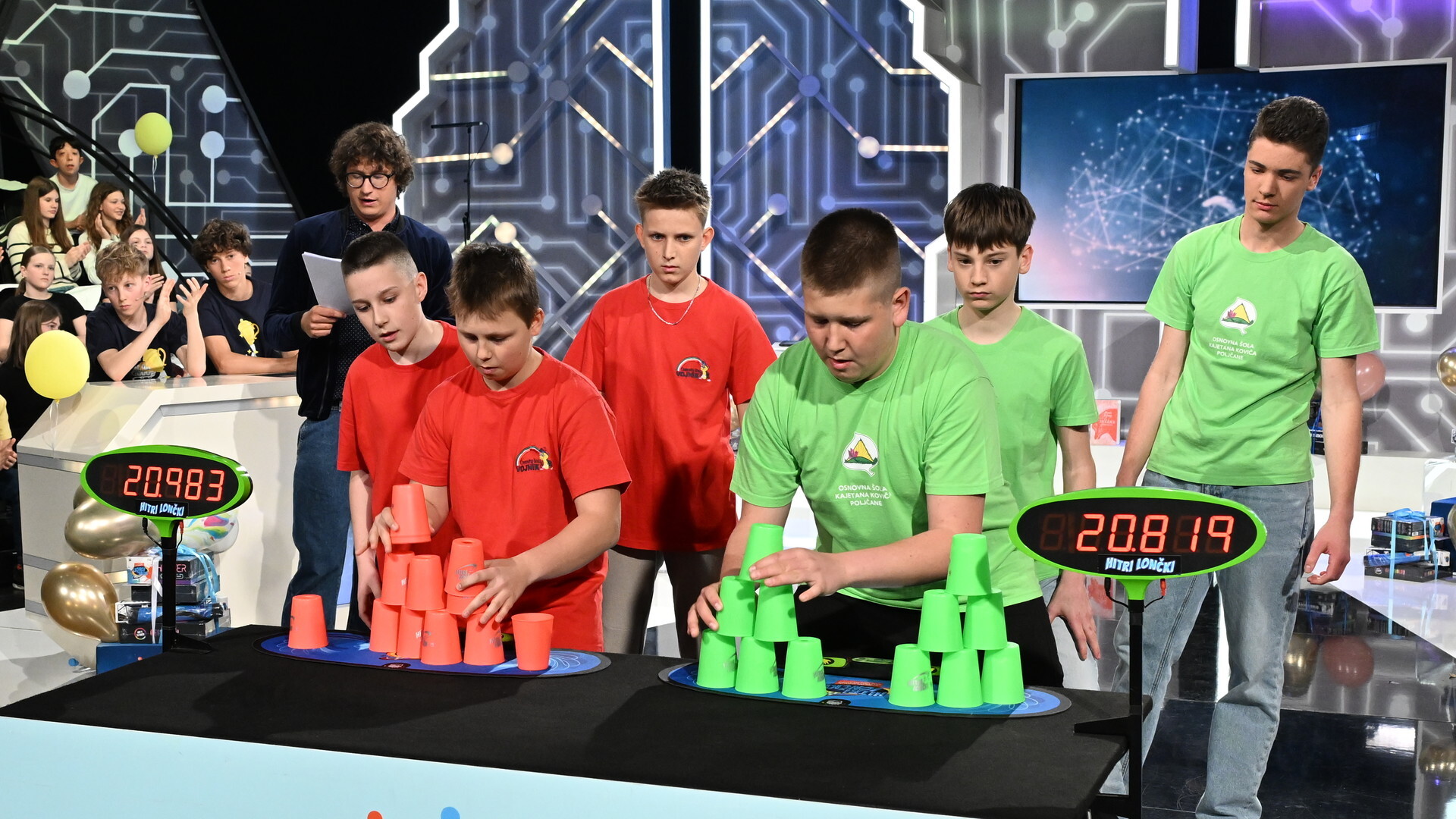 Trenutek resnice za hitrostne sestavljavce lončkov. V vedno napetem tekmovanju se bodo pomerili tekmovalci iz OŠ Vojnik (Nik, Julij, Gašper) in OŠ Kajetana Koviča Poljčane (Jan, Filip, Jernej).